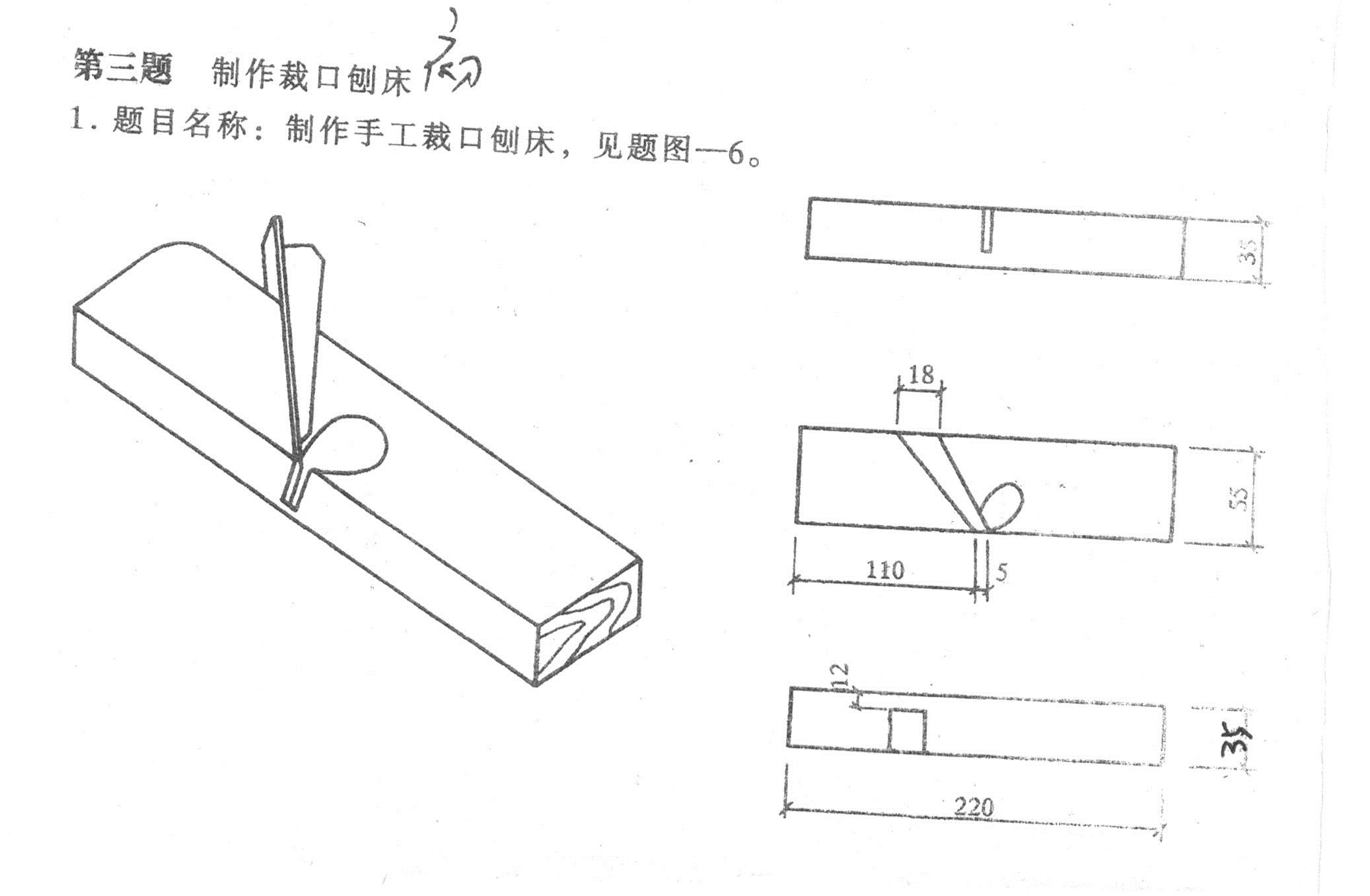 (2)題目?jī)?nèi)容 依據(jù)考生提供的材料和簡(jiǎn)單的圖示及給定的刨刃尺寸,操作者應(yīng)在限定的時(shí)間內(nèi),熟練地完成各道工序,獨(dú)立完成裁口刨床的制作,并當(dāng)場(chǎng)利用制成的裁口刨示范,嚴(yán)整使用效果。