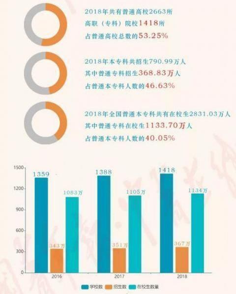因此2019年專科層次的招生人數(shù)將達(dá)到470萬(wàn)左右,占高考錄取人員總比例繼續(xù)上升,由于有很多高職院校采用單獨(dú)招生等形式也招收了部分中職畢業(yè)生,也會(huì)采用特殊形式招收部分退伍軍人和農(nóng)民工等,所以正規(guī)高考招收的人數(shù)增量并沒有想象中的100萬(wàn)那么多,但總的來(lái)說(shuō)是有較大增加的,所以高職?其浫》?jǐn)?shù)線會(huì)稍有下降。