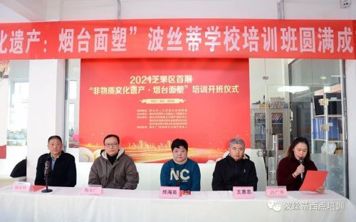 2021年12月13日上午,2021芝罘區(qū)首屆“非物質(zhì)文化遺產(chǎn)·煙臺面塑”培訓班在煙臺波絲蒂中西糕點職業(yè)技能培訓學校順利開班。本次培訓旨在更好地傳承發(fā)揚“煙臺面塑”這項非遺文化,推進國家非物質(zhì)文化遺產(chǎn)保護工作,培養(yǎng)一批德才兼?zhèn)涞暮细駛鞒腥,充分發(fā)揮膠東文化資源豐富和傳統(tǒng)文化底蘊深厚的優(yōu)勢,培養(yǎng)和帶動非遺專業(yè)人才更好地提升技能、就業(yè)創(chuàng)業(yè)。 煙臺市芝罘區(qū)公共就業(yè)和人才服務中心培訓科邢海英科長(中)、煙臺面塑傳承人本次培訓老師陶永廣(左二),中飯協(xié)膠東促進委研究院秘書長王惠忠(右二),煙臺市波絲蒂中西糕點職業(yè)技能培訓學校校長陳紅林(左一)共同出席了開班儀式。