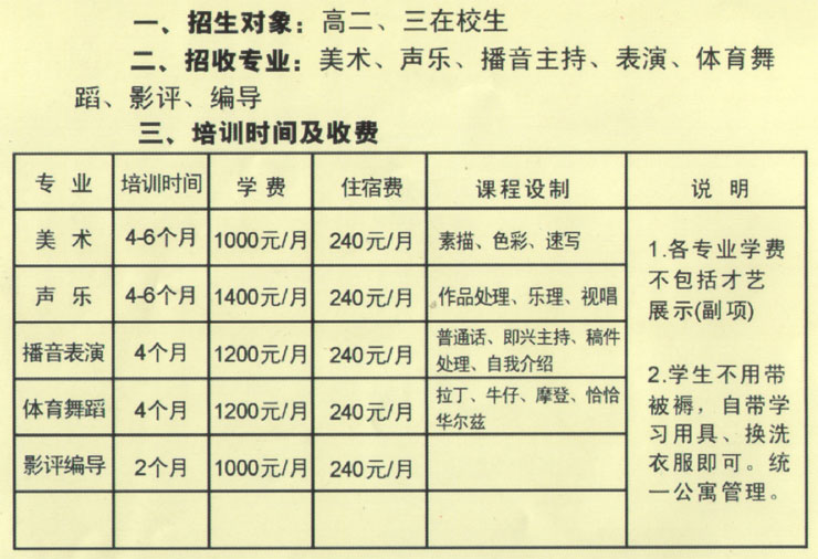 為使高三學(xué)生能順利的考入理想的大學(xué),實(shí)現(xiàn)你的人生理想,山東高端藝術(shù)職業(yè)培訓(xùn)學(xué)校2008年繼續(xù)舉辦藝術(shù)生高考培訓(xùn)。