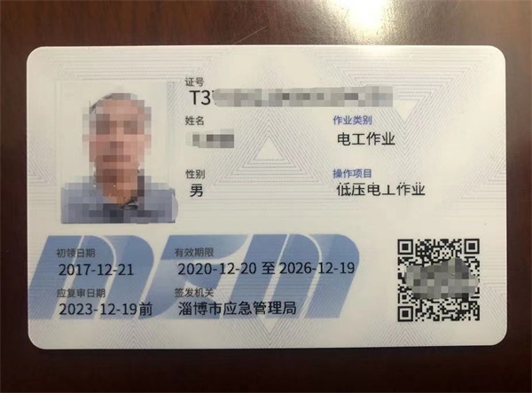 | 特種作業(yè)操作證 | 電工證(低壓/高壓) | 國家應(yīng)急管理局(淄博市應(yīng)急管理局頒發(fā)) | 2寸白底彩照1張,身份證正反面彩色復(fù)印件1張,學(xué)歷證書彩色復(fù)印件1張(沒有學(xué)歷證用戶口本本人頁代替一下) |